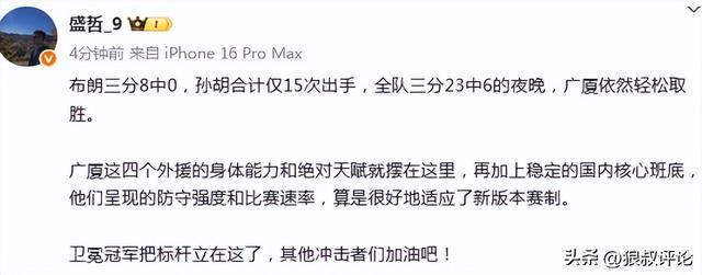 媒体人“盛哲”发文点评:布朗三分8中0,孙胡合计仅15次出手,全队三分23中6的夜晚,广厦依然轻松取胜。